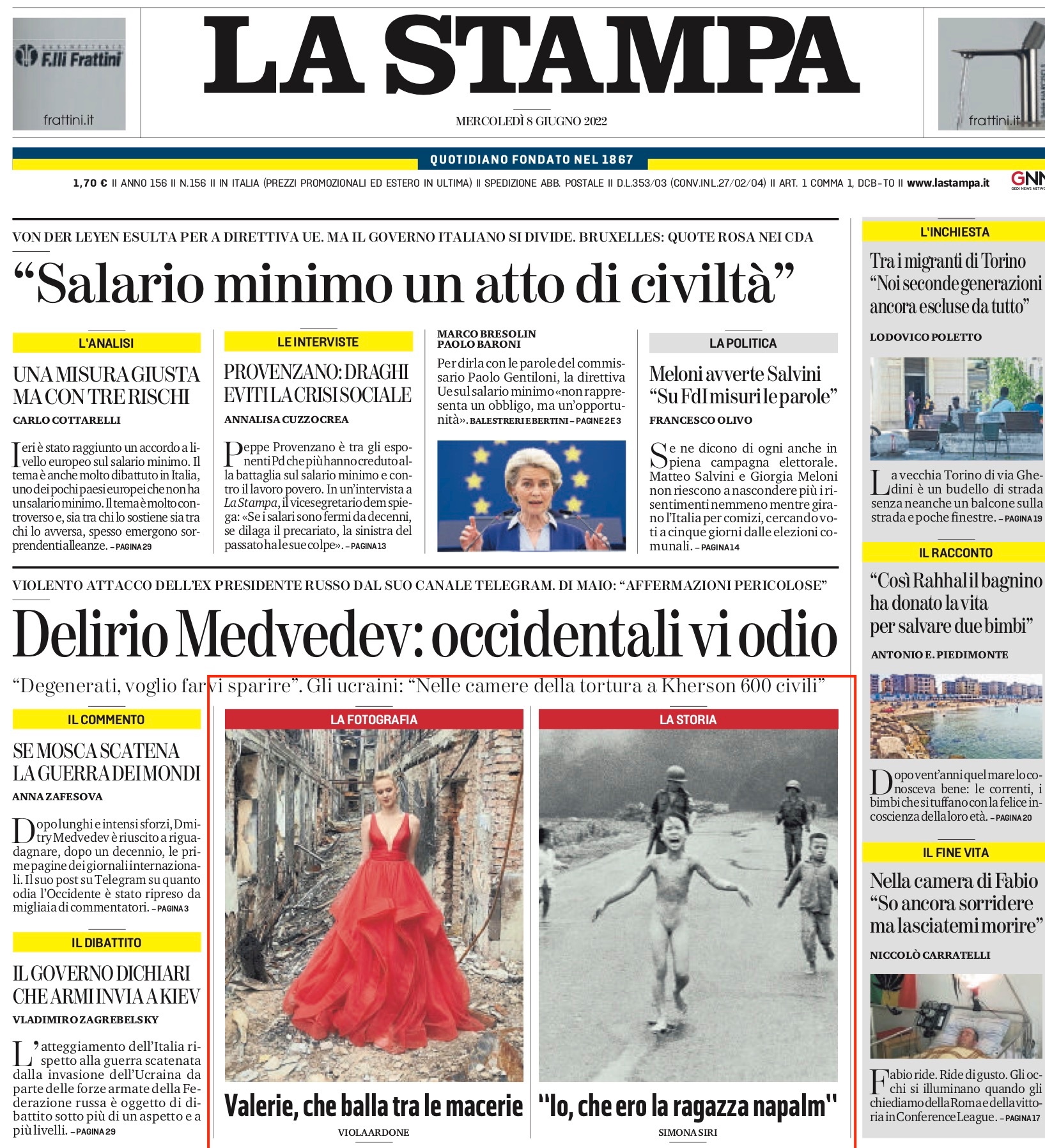 Італійська щоденна газета “La Stampa” на першій шпальті випуску за 8 червня, розмістила фото української дівчини на фоні зруйнованої харківської школи підписавши його як “Валері, що танцює серед маршів”.