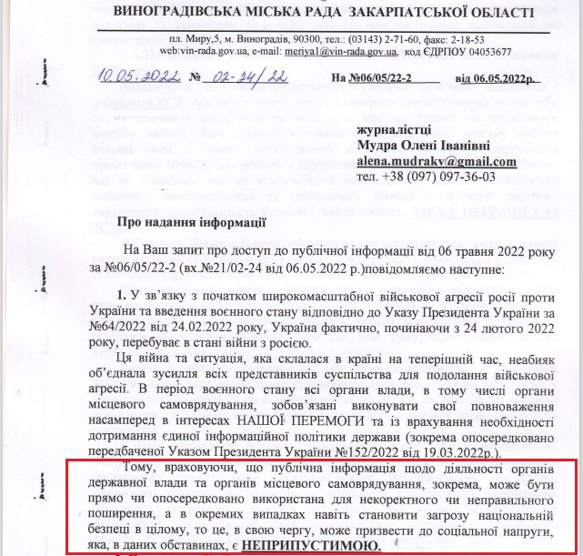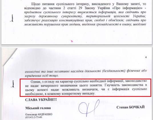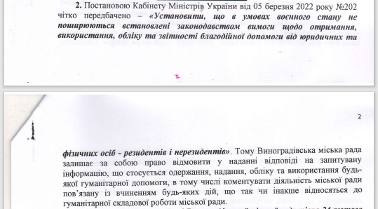 Обидві відповіді, друга з яких прямо порушила Закон «Про доступ до публічної інформації», закінчувались гаслом «СЛАВА УКРАЇНІ!!!» та підписом міського голови Виноградова.
